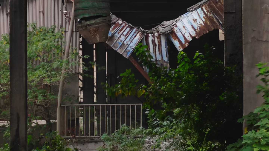 废弃厂区内随处可见摇摇欲坠的生锈铁皮。