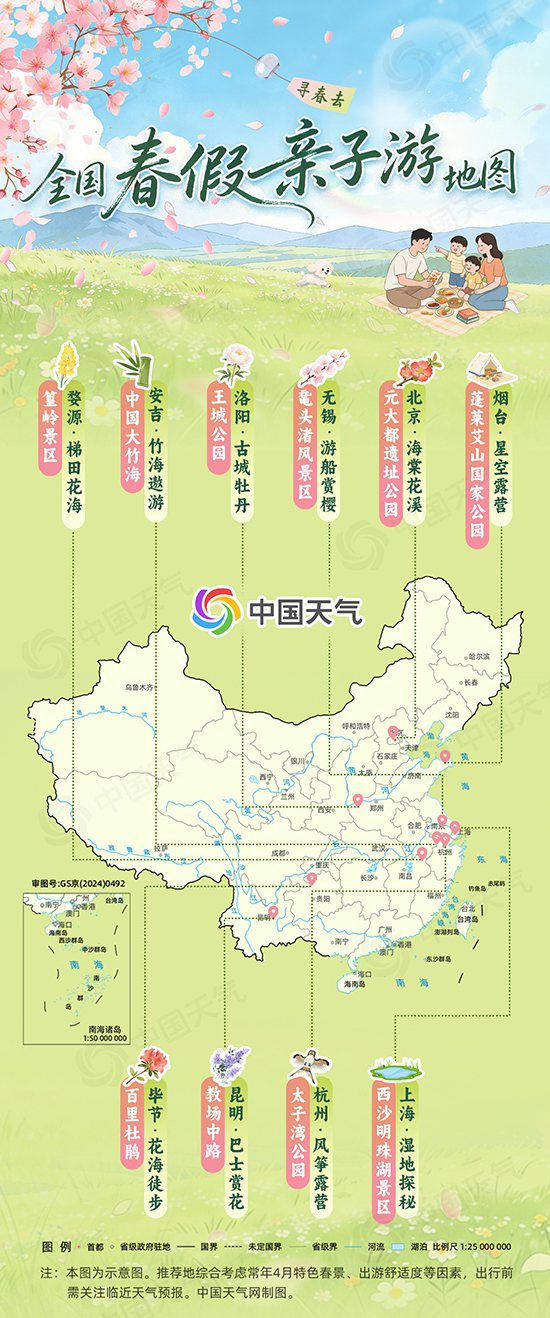 中国天气网讯 “胜日寻芳泗水滨,无边光景一时新。” 眼下春意渐浓,气温快速回升,春天的脚步正加速向北迈进。我国多地中小学纷纷推出春假政策,江苏、浙江、四川等地春假多集中在4月至5月,正是鼓励孩子走出课堂、亲近自然的好时机。中国天气网特别推出全国春假亲子游地图,精选南北十大打卡地,涵盖游船赏花、踏青徒步、民俗体验、自然科普等多样玩法,花式解锁春日限定亲子时光。