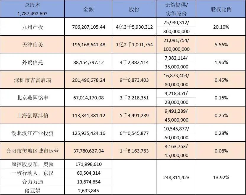 根据奥园美谷公司对外披露的信息,参与公司重整的主要投资者就位,包括产业投资者也是未来的大股东九州通旗下的产业投资公司,重整进程的主导者中国信达资产的代表天津信美,以及另外6家财务投资机构。